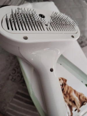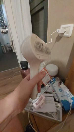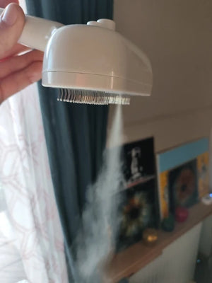 Steam loosens dander and tangles while soft pins protect skin, so grooming is faster, gentler, and leaves the house fur-free and peaceful.